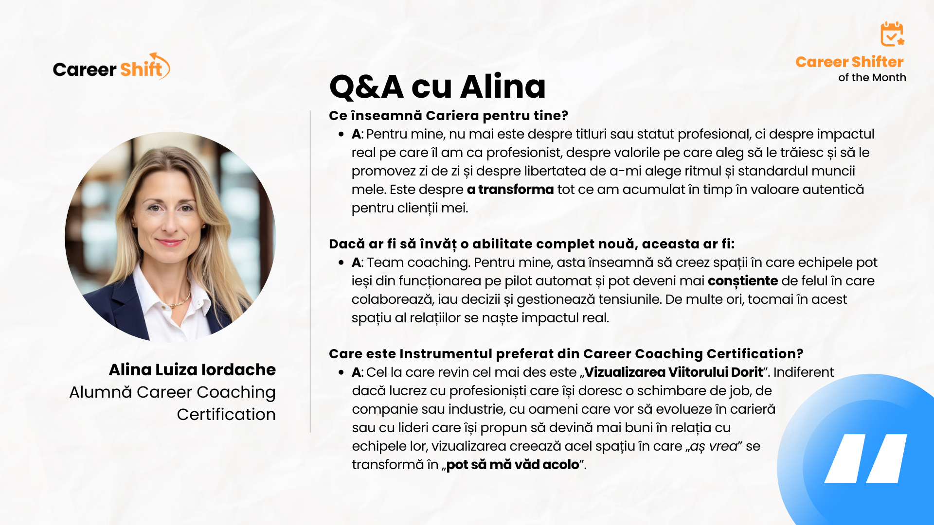 Luna aceasta o avem ca invitată pe Alina Luiza Iordache, Alumnă în programul Career Coaching Certification.